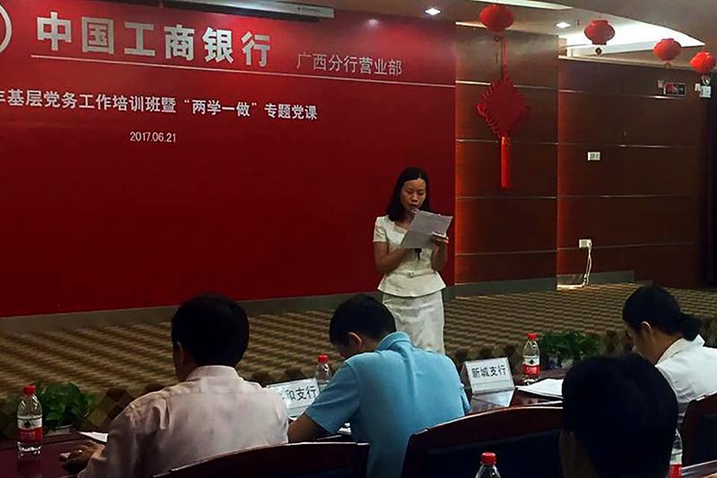 近日,工行广西区分行营业部举办2017年全辖基层党组织“两学一做”专题党课。邀请中共南宁市委党校党史党建教研部主任、南宁市反腐倡廉理论研究中心特约研究员覃玉滨老师授课;参加对象包括各基层党组织分管党建工作的负责人、党务工作者及党委组织部党员代表、学员,共计67人。