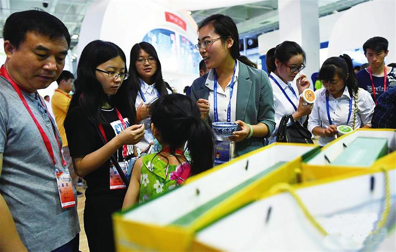 7月6日,一位工作人员(中)在“兰洽会”兰州馆内向参会嘉宾介绍当地土特产品。当日,以“共建‘一带一路’,推进互利共赢”为主题的第23届中国兰州投资贸易洽谈会在兰州正式开幕。据介绍,“兰洽会”期间将举办丝绸之路合作发展高端论坛、东盟贸易投资推介会、马来西亚—中国(甘肃)经贸合作交流会、陇台青年创业发展论坛等多项以“一带一路”为主题的论坛交流和投资贸易促进活动,为中外客商牵线搭桥,提供合作机遇。新华社供图