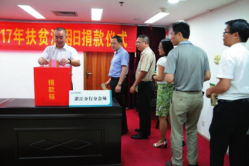 近日,农业银行广东省湛江分行举行“扶贫济困日”捐款仪式,分行领导、各部室干部员工,踊跃捐款、奉献爱心,助力湛江市精准扶贫、精准脱贫工作,以实际行动营造出参与慈善公益的良好社会氛围。当天,湛江分行本部263人参与捐款,共筹得扶贫救济款2.99万元。王朝华摄影报道