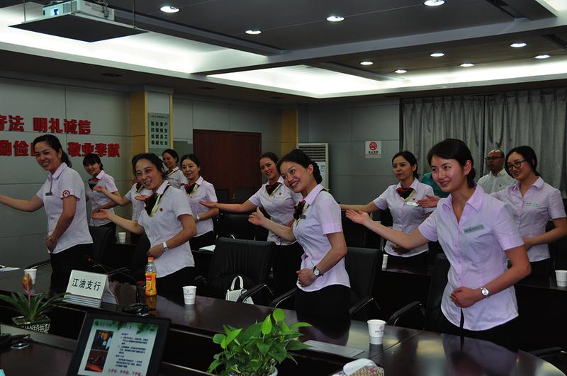 按照上级行创建中国银行业协会2017年度文明规范服务“百家示范网点”指示精神,为了进一步提升全员文明规范服务礼仪,提高网点整体服务质量水平,7月份以来,工行四川省江油支行邀请成都金控金融培训中心专家担任老师,组织网点员工利用班后时间集中开展文明规范服务礼仪强化培训,收到很好的效果。图为该行营业室员工在班后进行礼仪培训。