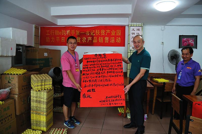 近日,工行广西区分行营业部积极支持“第一书记电商扶贫”项目,组织员工参与扶贫献爱心,踊跃认购昭平县平田村的致富乌鸡蛋,帮助农民圆致富梦。图为平田村村民送感谢信表达对工行的敬意。张文华摄影报道