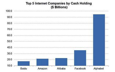 @新浪科技据最新数据显示,截至2017年第二季度末Alphabet拥有947亿美元的现金和短期投资,位居互联网公司榜首;阿里巴巴排名第三,拥有225亿美元的现金和短期投资,百度排名第五,拥有173亿美元的现金。