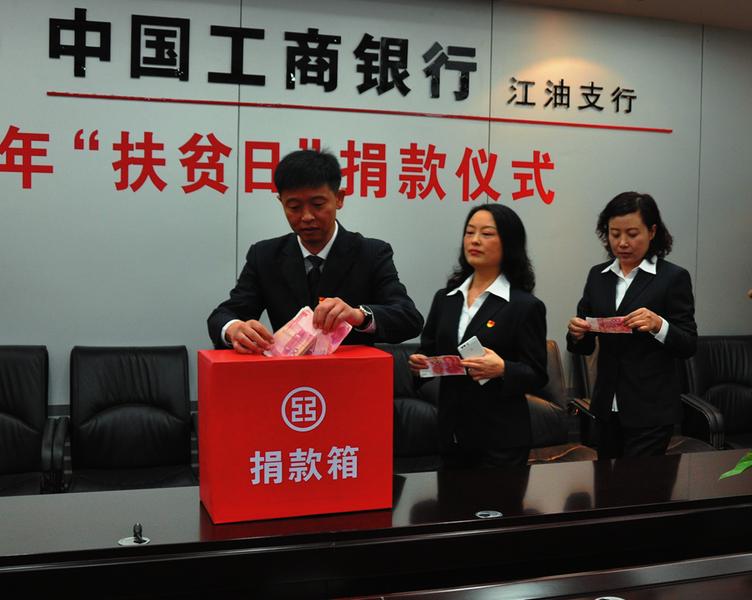 工在“扶贫日”前夕开展献爱心捐款活动,共计捐款1.41万元,全部捐赠给当地偏远山区扶贫点石元乡樟木山村。图为该行员工爱心捐款。卢勇摄影报道