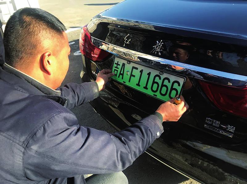 11月20日,长春市民为爱车安装新能源汽车专用号牌。当天,吉林长春、河北保定、福建福州、山东青岛、河南郑州、广东中山、广西柳州、重庆、四川成都、云南昆明等十余个城市开始启用新能源车专用号牌。按中国公安部统一安排,2018年上半年,将在全国所有城市全面启用。新号牌以绿色为主色调,意在体现绿色、环保、科技的理念,其号码比传统号牌增加一位。中新社供图