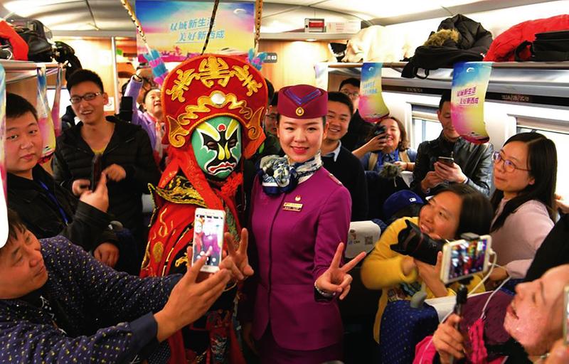 12月6日,随着两列CRH3A型动车组从成都、西安两地对发,标志着西安至成都高速铁路(简称西成高铁)正式通车。西成高铁线路起自陕西省西安市,途经汉中、广元进入四川省,在江油站接入既有的绵阳至成都至乐山铁路,抵达成都市,全长658公里。图为成都至西安首发列车上艺术家展示川剧变脸引关注。中新社供图
