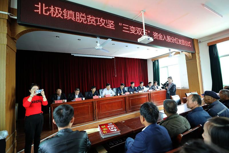 陕西信合彬县农商行金融支持彬县“三变”脱贫攻坚签约仪式上,彬县农商行董事长苟君旭与彬县扶贫办主任雷晓军签订扶贫贴息贷款协议。彬县北极镇举行“三变双五”资金入股分红发放仪式