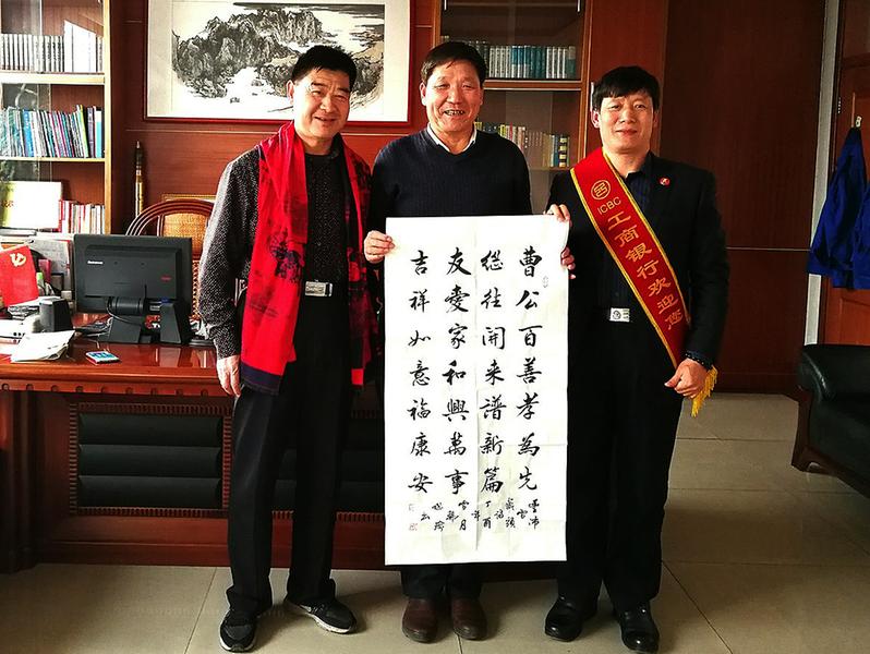 1月25日,工行山东省临沂市中支行员工丰沛雪(右)在走访客户时,得知临沂市金立机械有限公司行政副总曹继友(中)倡导孝忠家国企业文化,便为他量身创作了一幅藏头诗书法作品(“曹”公百善孝为先,“继”往开来谱新篇;“友”爱家和兴万事,“吉”祥如意福康安),以诗歌、书法会友,不仅加深了彼此友谊,而且收到了可喜的业务营销效果。梁克水摄影报道