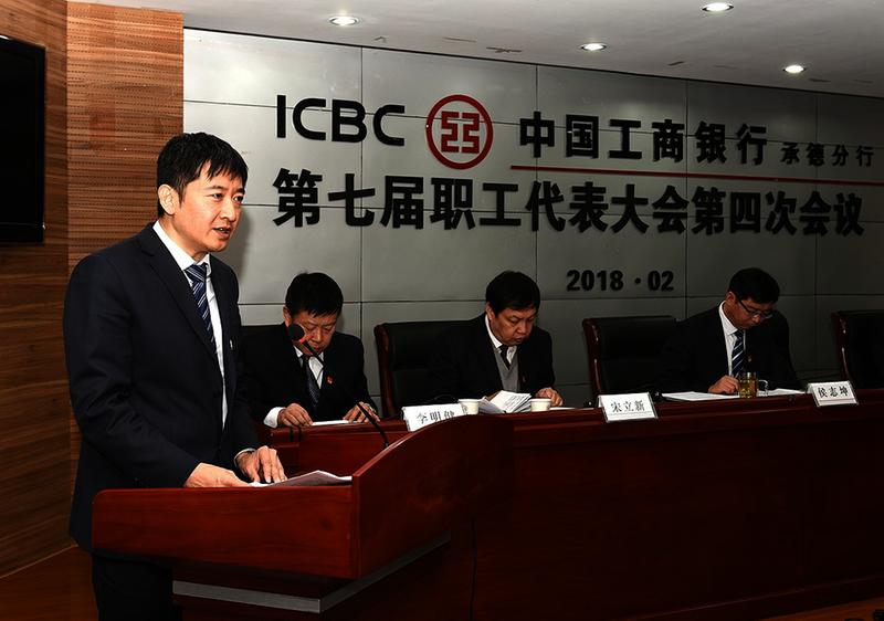 春节前夕,工行河北省承德分行召开第七届职工代表大会第四次会议,号召全辖干部员工统一思想、提高认识,认真落实省、市分行党委各项决策部署,保持奋发有为的精神状态,为推进改革创新和转型发展贡献智慧与力量。图为该行行长韩晓坤(左一)传达省行行长会议精神,部署2018年度重点工作。迟立伟摄影报道