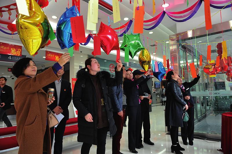 工行陕西省汉中分行近期在各营业网点营造节日气氛,以多种形式开展了“工迎新春、金狗闹元宵”营销宣传活动。图为近日该行前进路支行的大堂经理引导客户“猜灯谜、闹元宵”。吴剑