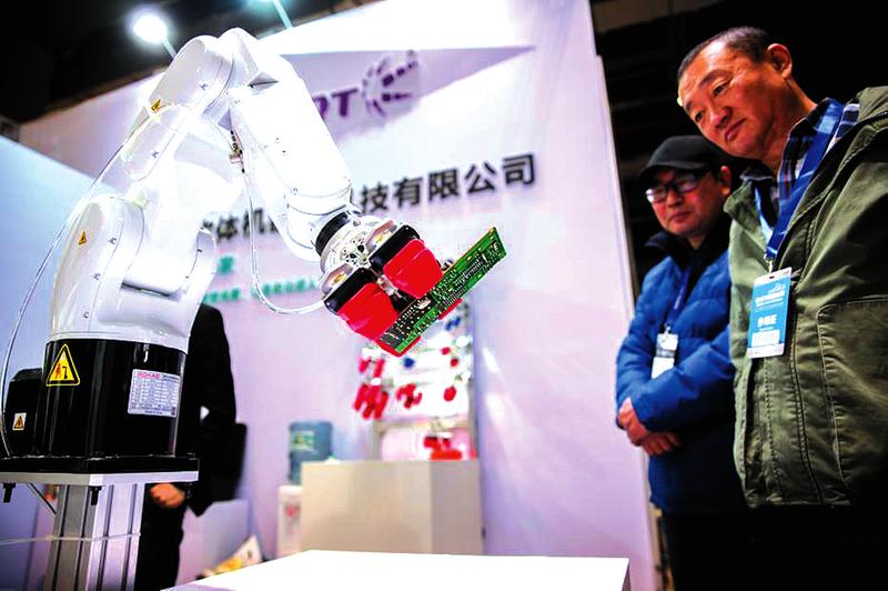 3月7日,2018第十五届上海国际现代工业智能装备展览会在上海国展中心开幕。来自世界各地1300家展商参展,共同聚焦工业4.0后未来智慧工厂的实现方案。展览共分为自动化设备、机器人及机器视觉、AGV小车、智能制造等五大展区,引领我国机器人产业快速健康发展。图为刚柔协作机械手臂演示抓取。中新社供图