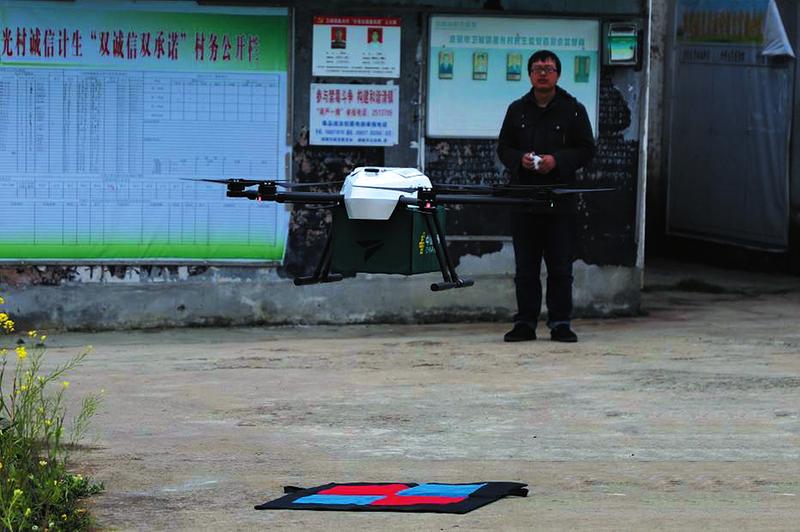 日前,贵州省清镇市卫城镇某快递企业起用智能无人机进行投递工作,投递员只需把邮件装载和取出,同时扫描无人机机身二维码发送起飞指令,就可使其自主起飞并降落到指定地点,整个过程受设置在浙江杭州的后台操控。据悉,无人机投递工作目前主要试用在当地的5个边远乡村,送件效率从过去的一天时间,减少到一小时。中新社供图