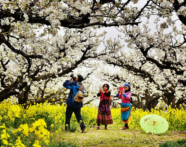近年来,农业银行江苏省徐州分行根据地方经济特色因地制宜,立足生态环境种植优质果树,打造绿水青山才是金山银山,累计发放“金农贷”1.87亿元,支持贫困山区发展观光旅游农业吸引游客,促进了农民增收致富。图为游客在铜山区汉王镇观赏万亩梨花。初涛摄影报道