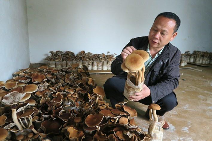 农业银行四川省广安分行围绕当地政府实施的农业产业结构调整,近几年先后发放贷款3000多万元助力“合作社+农户+基地”等经济实体的一体化建设,促进县域特色农产品种植业发展,以有效带动村民实现增收致富。图为该行贷款支持的岳池县石垭镇石坳村村民刘兵在查看桑枝菌。
