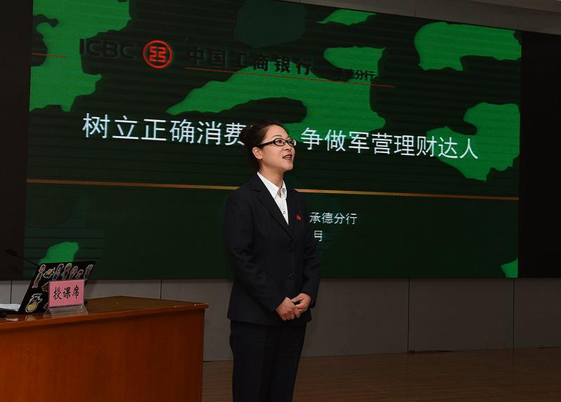 4月14日上午,工行河北省承德分行到当地驻军某部,开展“树立正确消费观念,争做军营理财达人”活动。宣讲军人理财、军人专属金融服务等产品,受到部队官兵欢迎。图为该行金融理财师谢士芯讲述当前官兵消费现状、存在问题及解决办法。迟立伟摄影报道