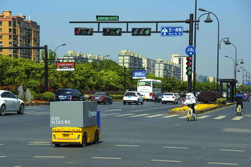 4月18日,菜鸟无人配送车在杭州上路开始开放路段测试。无人车定位在末端配送,车速最高控制在15km/小时,具备能识别红绿灯、交通标线以及应对突发状况的能力。据悉,此款无人车量产商用在即,年内将全面进入末端进行配送。新华社供图