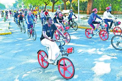 2017年12月3日,在肯尼亚首都内罗毕,选手们骑摩拜单车参加骑行活动。