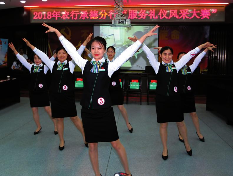 农业银行河北省承德分行日前举办“服务礼仪风采大赛”,以展现农行员工金融服务风采和蓬勃向上的职业形象,提升网点日常服务水平,营造浓厚的服务文化氛围,向“七一”建党日献礼。来自该行全辖11支代表队的60多名选手参加了比赛。尚玉壮于绍礼张扬摄影报道