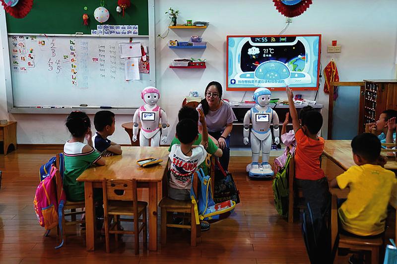 近日,南京阿凡达机器人科技生产的“i宝”人形机器人走进幼儿园协助教学。i宝”机器人高1米,有两种性别,旨在为儿童和老人提供教育、护理和陪伴。能提供教育、娱乐、交友、家长监护等功能,与孩子进行多层次互动。图为机器人与孩子们亲密互动。CFP供图