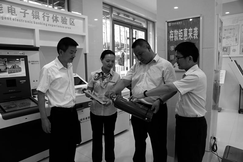 为应对入夏以来持续异常的高温天气,日前,农行湖北省钟祥市支行组织安全检查专班,对辖内网点、智慧银行、自助银行的水、电、气,以及玻璃幕墙、灯箱等重点安全设施进行检查,努力消除安全隐患,确保盛夏安全生产。图为检查人员检查网点消防器材。姚世清摄影报道