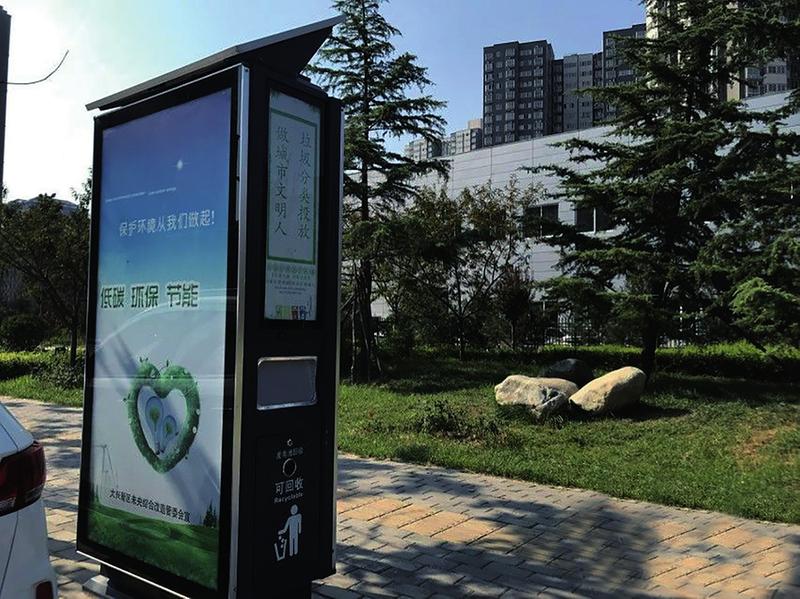 近日,一种头顶太阳能电池板的智能垃圾桶亮相西安街头。该智能垃圾桶两侧各有一个感应垃圾门,当用户扔垃圾时,垃圾门会自动打开,同时伴有语音提示。桶体自带的灯箱,可以做照明,垃圾桶还安装了USB接口,可用于数码产品充电。CFP供图