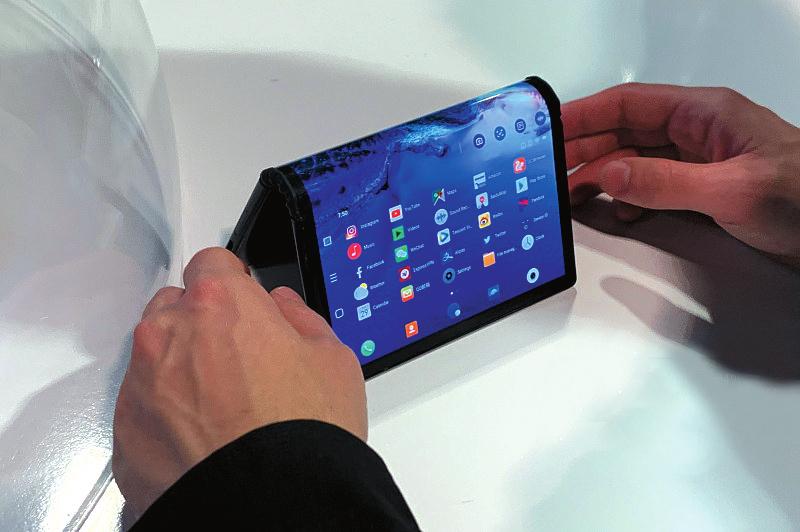 在日前开幕的2019年美国拉斯维加斯消费电子展上,中国企业柔宇科技公司率先推出全球首款量产的可折叠屏幕手机FlexPai和平板电脑设备,据悉,FlexPai搭载了超大折叠屏,可以实现从“0度到180度”弯曲,并支持超过20万次弯曲。CFP供图