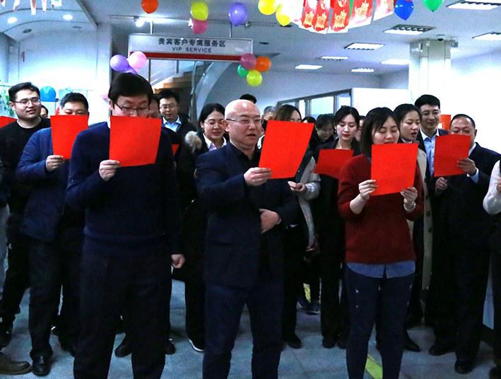 近日,工行青岛市莱西支行营业部自导自演了“喜迎2019”文艺节目,丰富多彩的演出,赢得了员工的阵阵喝彩。图为该营业部员工合唱《我和我的祖国》。王兰青摄影报道
