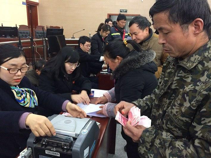 “感谢法院撑腰维权,感谢农行支付给力。”刚刚领到经法院依法追回拖欠工资的一位农民工感激地说。近日,农行四川省乐山市夹江支行组织人员,来到县法院办公所在地,现场将法院为农民工追讨回的拖欠的168万多元工资,一一如数发到某企业的103名农民工手中,受到农民工欢迎、点赞。 刘礼成 摄影报道