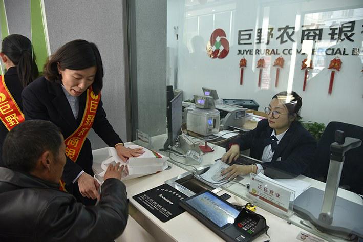春节期间,山东省荷泽市巨野农商银行为满足客户量增加的需求,把总行机关部室人员分派到39处营业网点,为客户提供大堂服务,引导客户业务办理、提供咨询服务、帮助农民工领取工资,让客户享受到幸福、祥和的服务。图为该行营业部员工帮助农民工提取工资。田忠华摄影报道