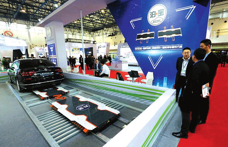 3月26日,2019中国北京国际城市停车产业博览会在北京开幕。展览聚焦解决城市“停车乱、停车难、交通拥堵”,展示了智慧城市建设,智能交通发展,推进城市停车产业有序发展的创新技术、产品和商业模式。图为观众在参观机器人智能泊车。CFP供图