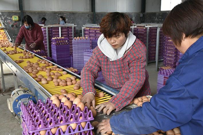 山东省菏泽鑫航禽业有限公司依靠科技创新,采取饲料加工、饲养、饮水供应、鸡蛋拾捡、粪便清理等全自动蛋鸡养殖模式,采取自筹资金+农商银行贷款的投资方式,20年发展为资产近3000万元的现代化蛋鸡养殖场。图为日前该公司鸡蛋整装车间装运出口欧洲产品。田忠华摄影报道
