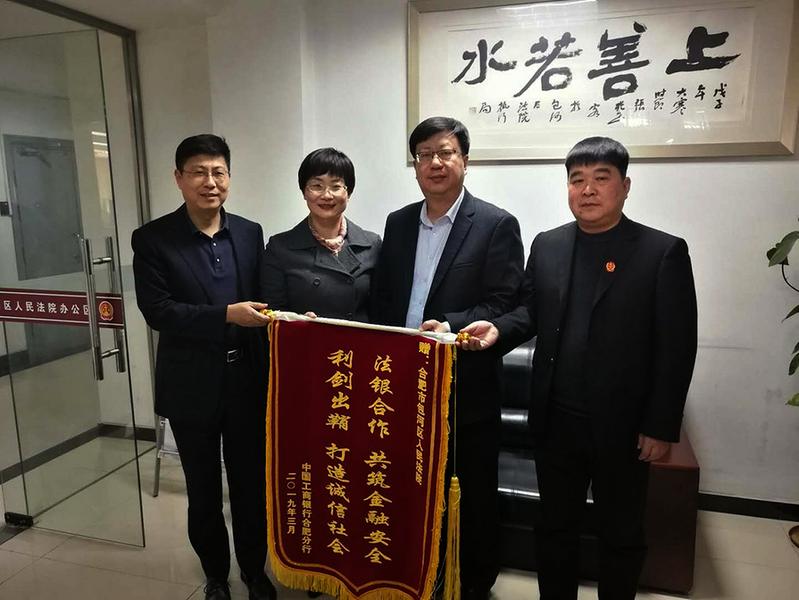 工商银行合肥分行近期联合合肥市包河区人民法院执行局,开展惩治“老赖”金融专项“雷霆”联合行动,发力金融专项执行攻坚战,对“老赖”果断亮剑。在此次雷霆行动攻坚战中,该行共上门强制执行14户,涉案标的金额506万元;采取拘传措施5人,张贴迁出公告8份;现场和解案件4件,金额176万元;现场现金归还执结1笔20万元;查封冻结老赖存款23万元。图为该行向包河区法院执行局送锦旗。龚轩摄影报道