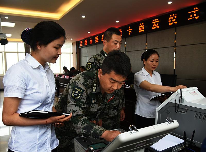6月21,工商银行兰州分行与中国人民解放军甘肃省兰州警备区,共同举行“兰州市民兵保障卡”联名卡首发仪式。图为该行安宁支行业务人员现场激活启用“民兵保障卡”,并向参训民兵介绍“民兵保障卡”的使用功能。