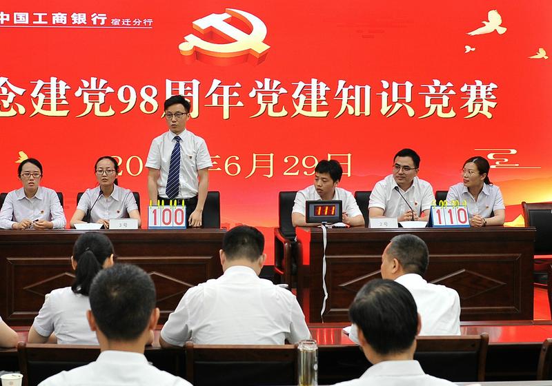 工行江苏省宿迁分行近日组织开展“纪念建党98周年党建知识竞赛”,全辖基层党组织共8支代表队参赛,进一步增强了全体党员对党史、党章、党纪党规等的理解和认识,更加坚定了共产主义的理想信念和在日常工作中充分发挥好党员的先锋模范带头作用。胡继生 摄影报道