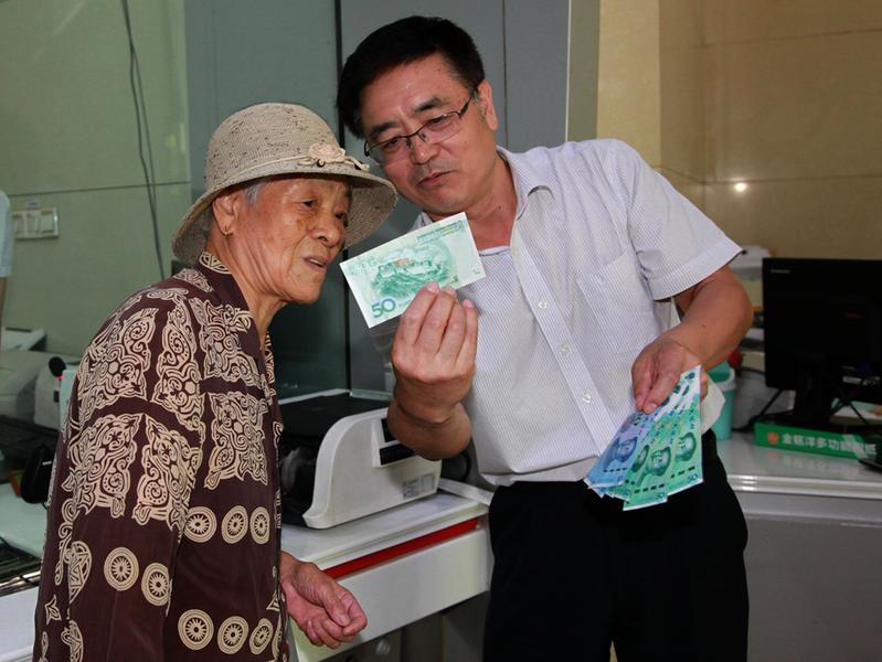 8月30日,在新版第五套人民币发行当天,工商银行山东省淄博分行积极开展柜面宣传工作,向前来办理业务的客户讲解新版人民币特点,指导如何鉴别和使用新版人民币。郭天民张国摄影报道