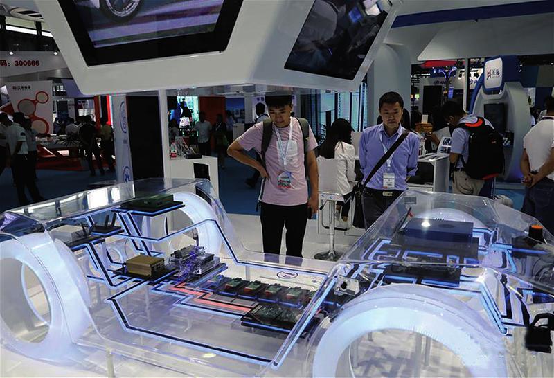 9月3日,第十七届中国国际半导体博览会在上海新国际博览中心开幕,据了解,目前集成电路已经占到半导体产业的80%,近几年随着集成电路的蓬勃发展,半导体在工业生产上的重要作用更加凸显,博览会集中展示了集成电路产业的新技术与新成果。图为参观者在一组车用集成电路展品前驻足观看。新华社供图