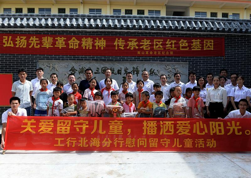 在新学期开学之初,工商银行广西区北海分行组织干部员工到合浦公馆镇南山小学慰问留守儿童,慰问组由该行党委书记、行长左清喜带队,副行长杨通运、纪委书记曾祥宇、副行长陈文及各党支行书记等参加慰问活动。慰问组首先与南山小学校领导就慰问活动的目的、意义进行沟通与交流,并将书包、笔、笔记本等文具慰问物品送到学校20名留守儿童手中,鼓励同学们努力学习,不辜负社会及学校对他们的关爱。