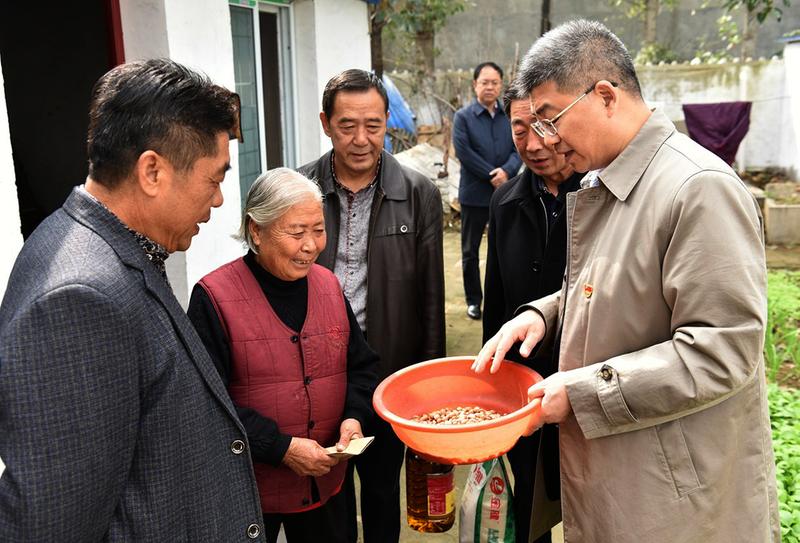 近3年来,工商银行河南省南阳分行向扶贫帮扶村宛城区郭厂村共投资33万元,为村里购买垃圾清运车、花生脱粒机、拖拉机、旋耕机,建草莓种植大硼,精准助力该村打赢脱贫攻坚战,取得显著成绩,该行被南阳市委、市政府授予‘千家帮千村’先进企业。图为10月17日国际扶贫日当天,该行主要领导到郭厂村看望贫困群众。蒋红升 摄影报道