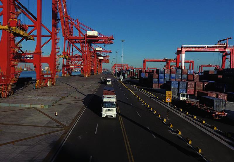 近日,河北省唐山港引进的以5G技术为支撑的无人驾驶集装箱卡车完成港内运行测试,进入试运行阶段,标志着全球首个实现无人集装箱卡车水平运输的项目正式启动。新华社供图