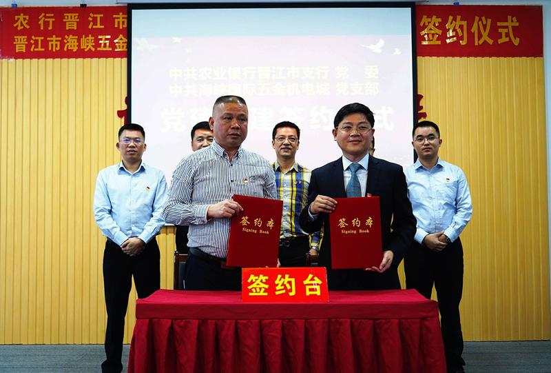 近日,农行福建省泉州市晋江支行积极探索基层党建新模式,结对五金机电城党支部,联合开展“党建共建与金融合作”活动及合作签约仪式。该行以此次共建活动为契机,积极开展服务产品和服务模式的创新,通过专业市场流量贷、市场通等一揽子金融产品,持续提升金融服务水平,助力“乡村振兴”,为小微企业提供“源头活水”。苏炳秋 摄影报道