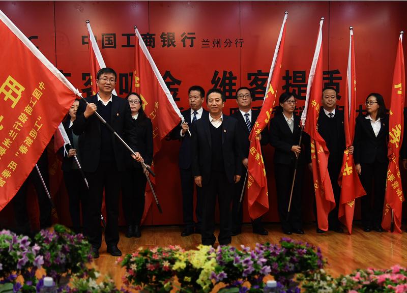 近日,工行兰州分行召开“获客吸金维客提质2019-2020工迎新春”旺季营销誓师大会,点燃全辖员工积极投身旺季营销活动的“血性”,发动全辖“战舰”上的每个“零件”快速运转,以确保2019年末圆满收官和2020年初实现“开门红”。图为该行蒲五斤行长(中)向各支行授旺季营销战旗。冯作平 摄影报道