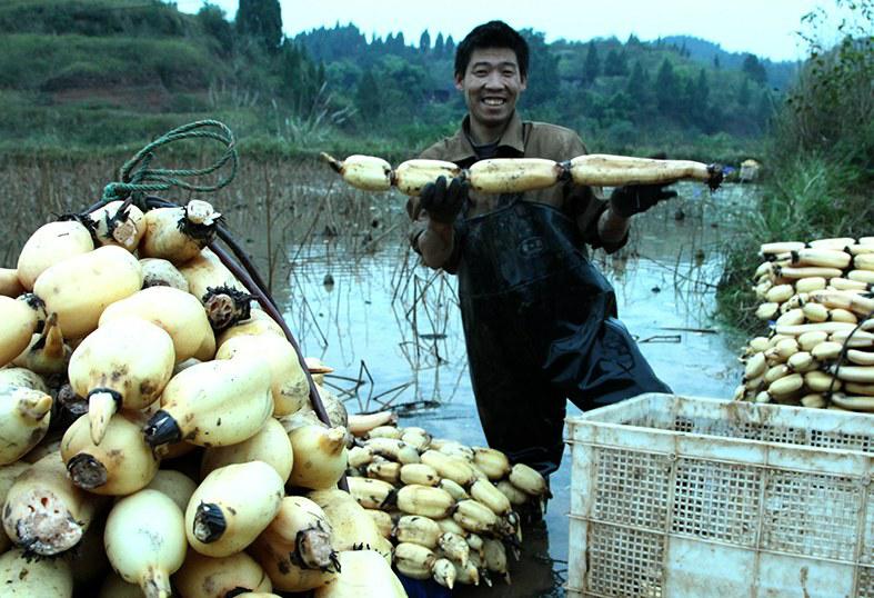 服务下乡,创新服务模式,加大信贷投入,通过对种植大户、养殖大户、家庭农场发放农户小额贷款、农村个人生产经营贷款等,破解种植、养殖户资金瓶颈,使农民逐步实现脱贫致富。截至目前,该行已发放农户小额贷款、农村个人生产经营性贷款4358万元,积极支持当地种植业发展。图为该行信贷支持的龙台镇箭滩村莲藕种植户在采收莲藕。李华摄影报道