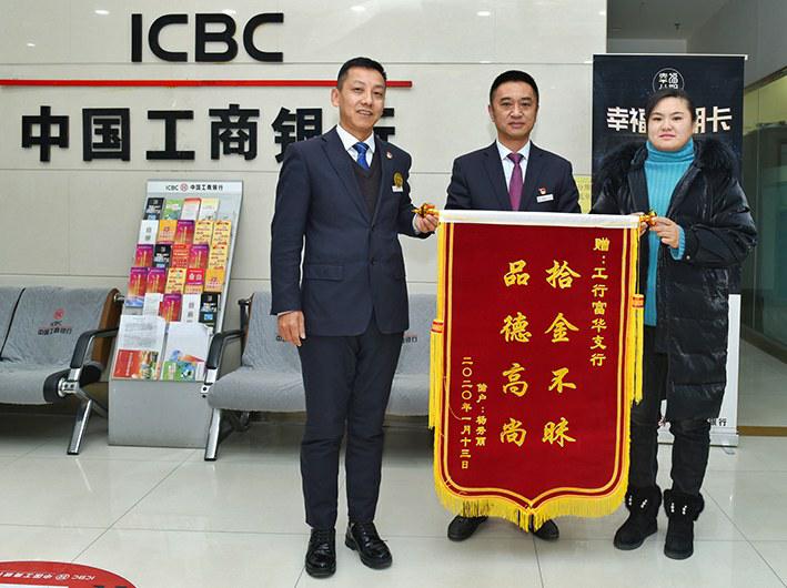 1月13日下午,工行河北省承德市富华支行的大堂经理侯永红巡查大厅外ATM区域时,发现一部客户遗失的华为P30手机。他马上向值班行长汇报情况,经分行保卫部查看监控录像核对,找到了失主杨女士并及时归还。15日,杨女士给支行送来锦旗表示感谢。图为该行行长李成玉(左)、大堂经理侯永红(中)与杨女士合影。迟立伟摄影报道