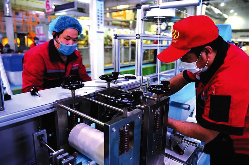 面对部分产业上下游配套无法及时跟上,产业链协同联动困难问题,河北沧州中捷产业园区制定复工复产保障方案,帮助企业优化配置原料、用工等各种生产要素,鼓励企业对技术、设备等进行“微改造”,开发生产新产品。目前,园区已有50多家企业实现复工复产。图为经过“微改造”后的一条口罩生产线。新华社供图