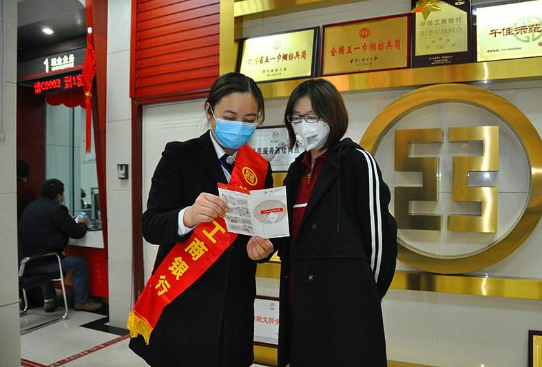 保护好自身财产不受损失,2月25日至26日,工行四川省绵阳市江油支行营业网点立足大堂服务,积极开展了“防诈骗、保安全”金融知识宣传活动,员工们围绕抗疫期出现的“虚假捐款诈骗”“售卖口罩、酒精等物质类诈骗”“直播教育诈骗”“免减费诈骗”等套路、手段,详细进行宣传讲解,还对反洗钱有关知识进行讲解,受到客户广泛好评。图为该行营业室大堂服务人员向客户宣传防诈骗知识。卢勇摄影报道