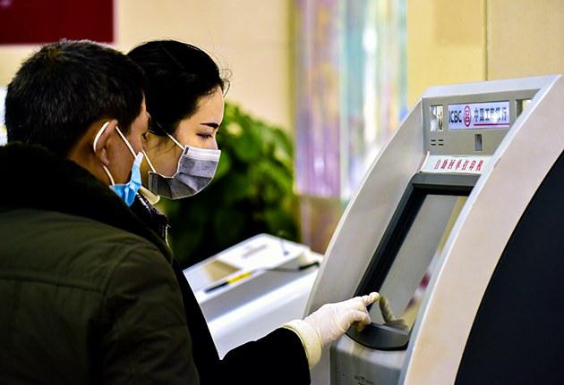 3月中旬起,工商银行湖北省咸宁分行做好“疫情防控”和金融服务“两手抓”,通过抓实营业环境的消毒杀菌和出入营业间客户红外线体温检测工作,限制进入营业区人员数量,做到有序复工复产。图为该行营业部大堂经理(右)辅导客户使用自助终端设备。廖宗俊摄影报道