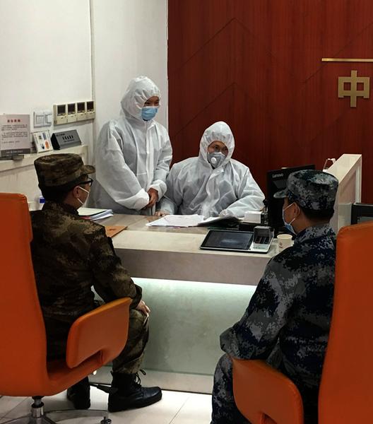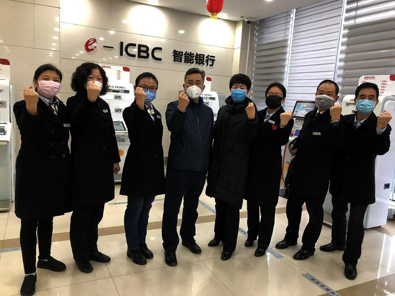 在疫情防控的严峻时期,武汉分行党委书记邱世杰(左四)与武昌三八支行员工一同战疫。