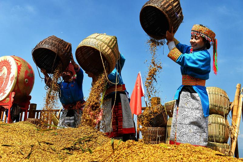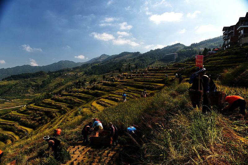 10月10日,怀化市溆浦县葛竹坪镇山背村,举行“山背花瑶梯田首届丰收节”活动。1000余名花瑶和汉族同胞一起体验酣畅淋漓的收稻乐趣,感受丰收的喜悦。