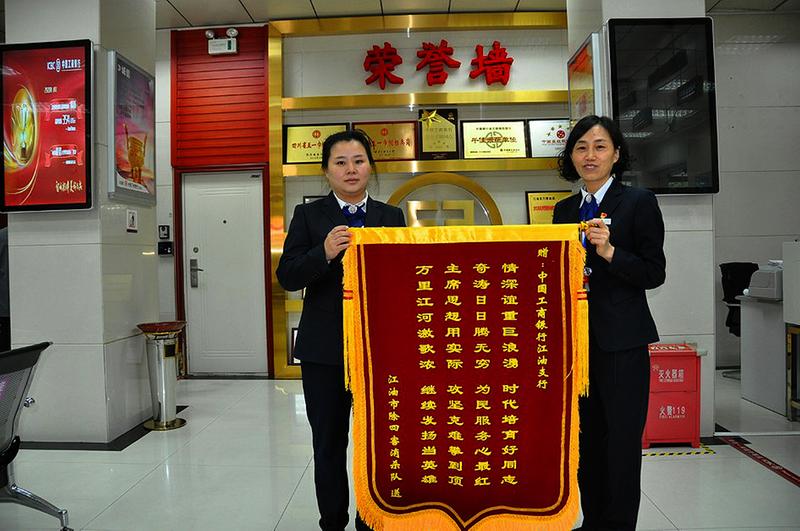 工行四川省绵阳市江油支行营业室大堂服务人员日前在自助存取机处发现客户遗失的1200元现金,根据内部系统查询客户信息后及时主动联系客户归还到客户手中。该客户是江油市除四害消杀队一名退休人员,他在感动之余,编写了一首赞扬工行员工风格高尚、服务热忱优质的诗,并请人制作成一面锦旗送到网点。