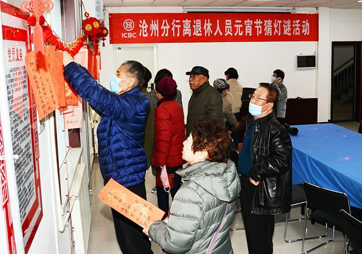 为了让离退休老同志过上一个欢乐、祥和、幸福的元宵节,工行河北省沧州分行近日组织举办了分行本部离退休人员元宵节猜灯谜活动。广大离退休老同志热情高涨,踊跃参加,对猜对两条以上谜语的给予了适当奖励,共有100多位离退休老同志参加活韦殿禄闻强摄影报道