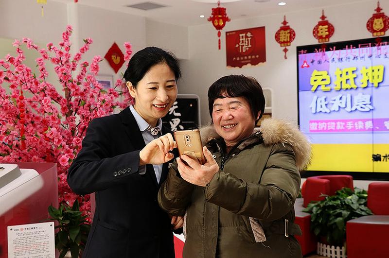 郑州工行人加快“数字工行”战略推进步伐,通过线上渠道为城乡客户提供更高效优质的金融服务。图为该行自由贸易试验区分行网点员工在手把手地教老年客户如何使用手机银行办理业务。